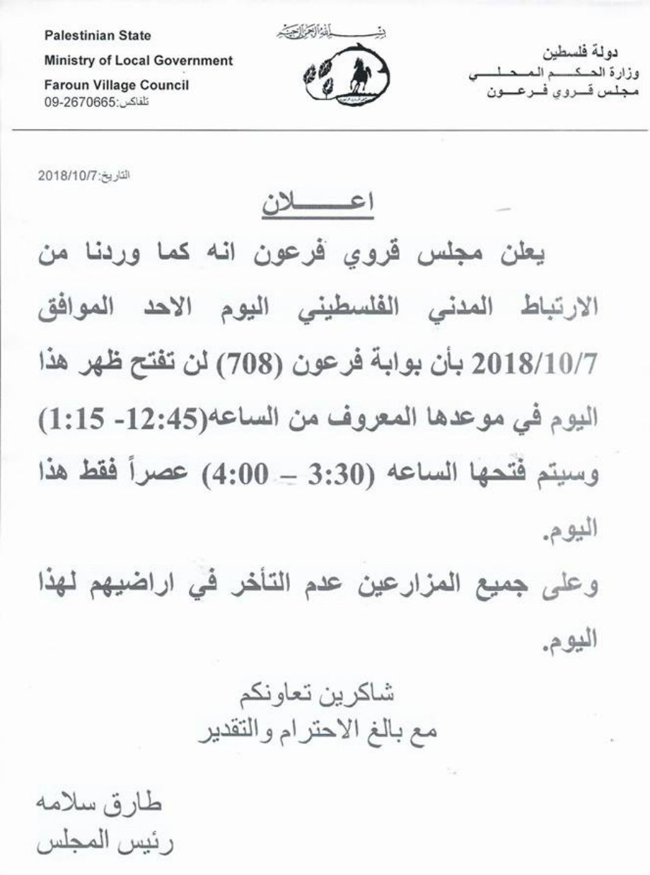 مجلس قروي فرعون يعلن عن موعد فتح بوابة فرعون 708 ليوم الأحد 07.10.2018.