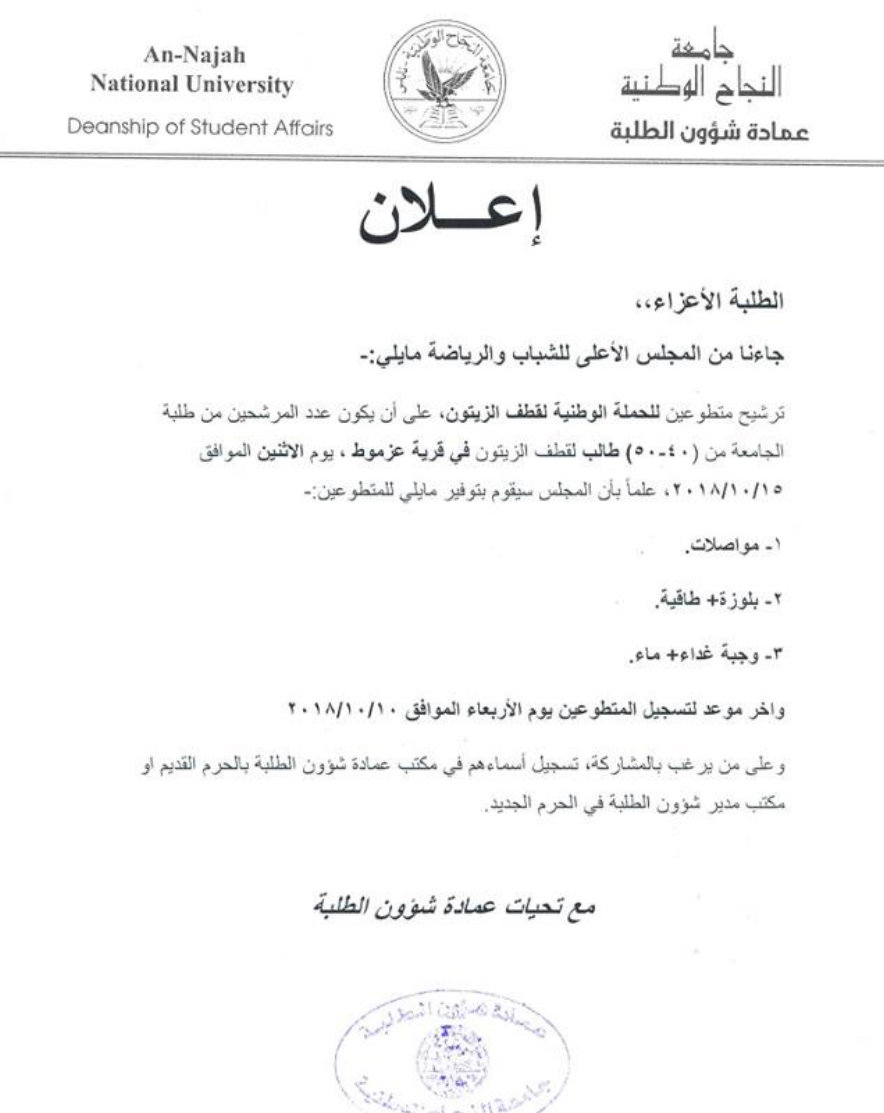 دعت جامعة النجاح، يوم الأحد 07.10.2018، وبناءً على طلب من المجلس الأعلى للشباب والرياضة إلى التطوع للمشاركة في قطف الزيتون في عزموط شمال شرق نابلس.