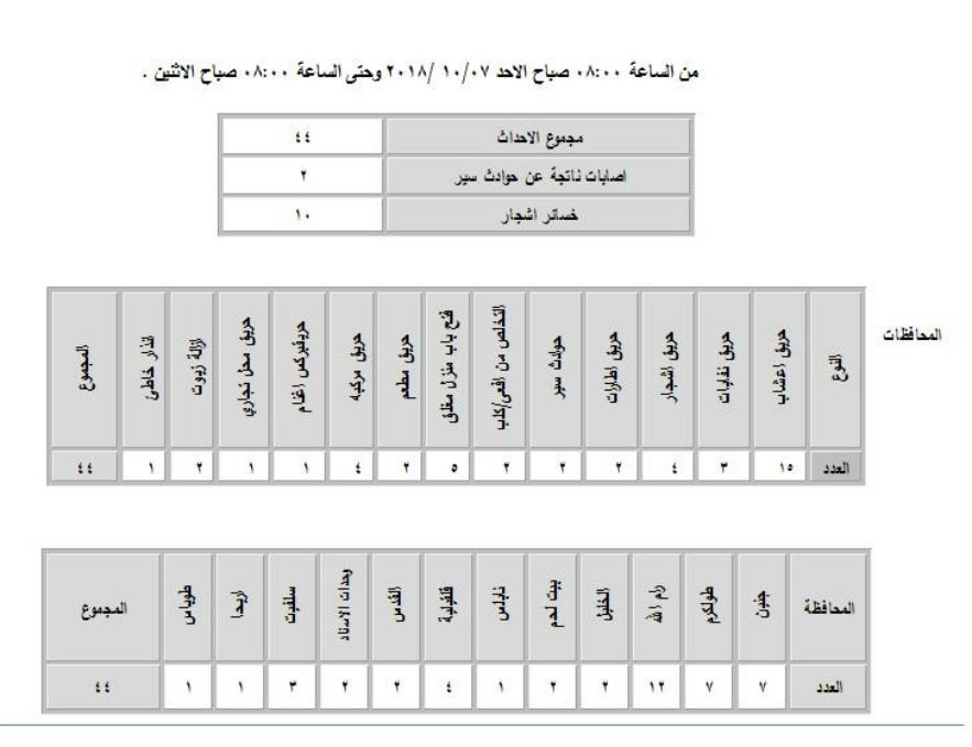 نشرت طواقم الدفاع المدني يوم الاثنين 08.10.2018، مجموع إنجازاتها خلال 24 ساعة الماضية، حيث تعاملت طواقم الدفاع المدني مع (44) حادثا، منها (32) حادث إطفاء و(12) حادث إنقاذ.