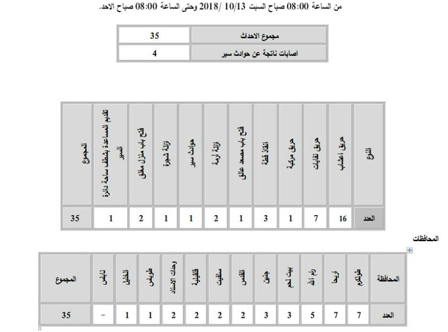 نشرت طواقم الدفاع المدني يوم الأحد 14.10.2018، مجموع تدخلاتها خلال الـ 24 ساعة الماضية، حيث تعاملت الطواقم مع (35) حادث إطفاء وإنقاذ، كان منها (24) حادث إطفاء و(11) حادث إنقاذ.
