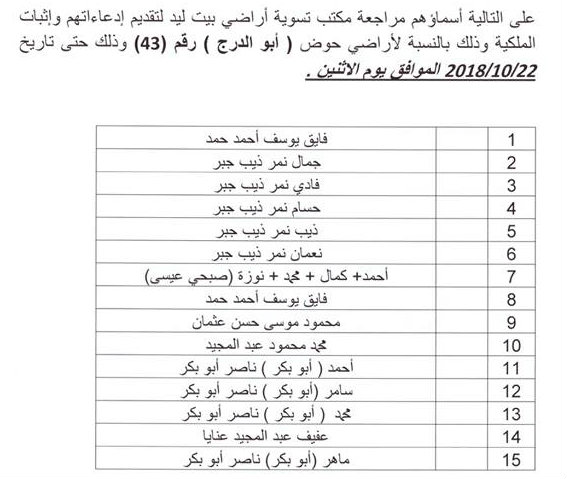 مكتب تسوية أراضي بيت ليد يدعو بعض المواطنين لمراجعته.