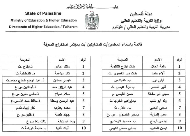 تربية طولكرم تدعو معلمي ومعلمات التربية الرياضية للمشاركة في مؤتمر استخراج المعرفة وتنشر قائمة بأسماء المدعوين.