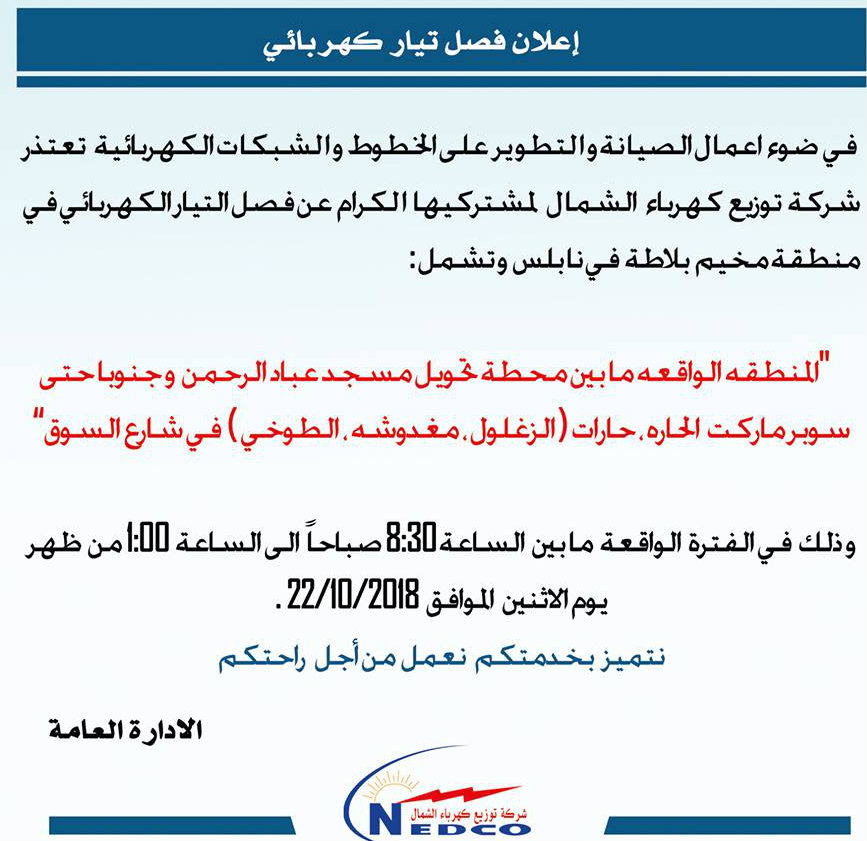 تعلن شركة توزيع كهرباء الشمال لمشتركيها عن فصل الكهرباء يوم الاثنين 22.10.2018، لأربع ساعات في نابلس.