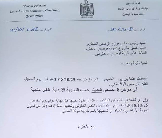 مكتب التسوية في قرية قوصين يدعو إلى ضرورة مراجعته بخصوص الحوض رقم 8.
