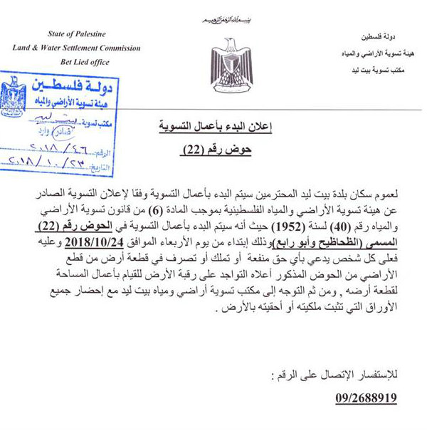 تعلن بلدية بيت ليد يوم الثلاثاء 23.10.2018، عن بدء أعمال التسوية في حوض رقم 22 المسمى بـالظحاظيح وأبو رابع.