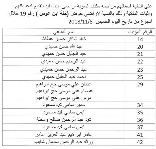 نشرت بلدية بيت ليد يوم الخميس 25.10.2018، أسماء بعض المواطنين وذلك لمراجعة مكتب تسوية الأراضي والمياه في البلدة بخصوص حوض رقم 22.