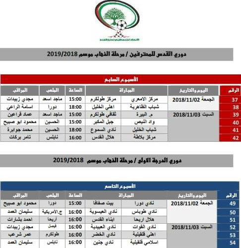 أعلنت لجنة المسابقات العامة بالاتحاد الفلسطيني لكرة القدم، الاثنين 29.10.2018، عن جدول مباريات الأسبوع السابع من دوري القدس للمحترفين والتاسع من دوري الدرجة الأولى، وذلك كما يلي: