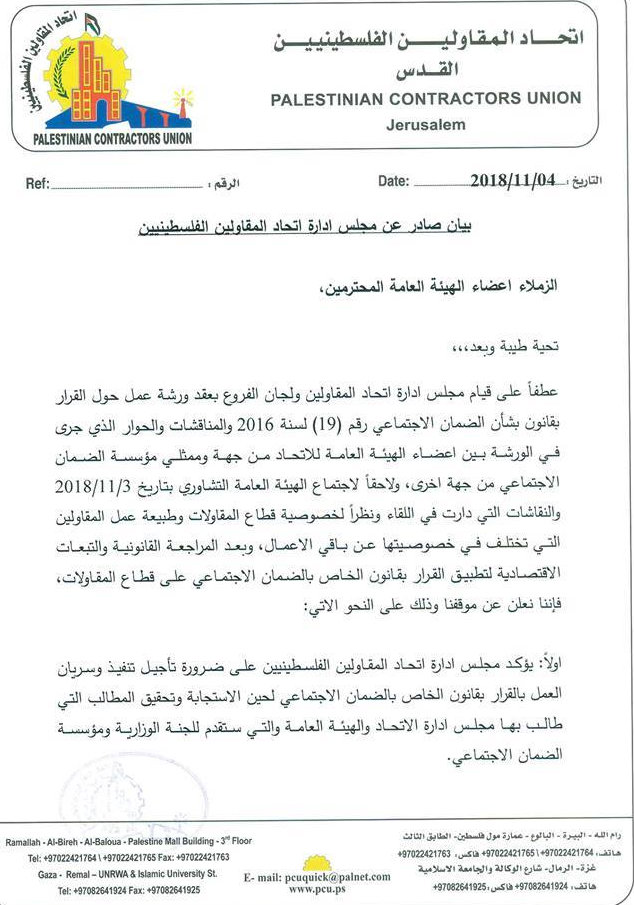 اتحاد المقاولين الفلسطينيين ينشر بياناً يوضح فيه موقفه من قانون الضمان الاجتماعي بشكله الحالي.