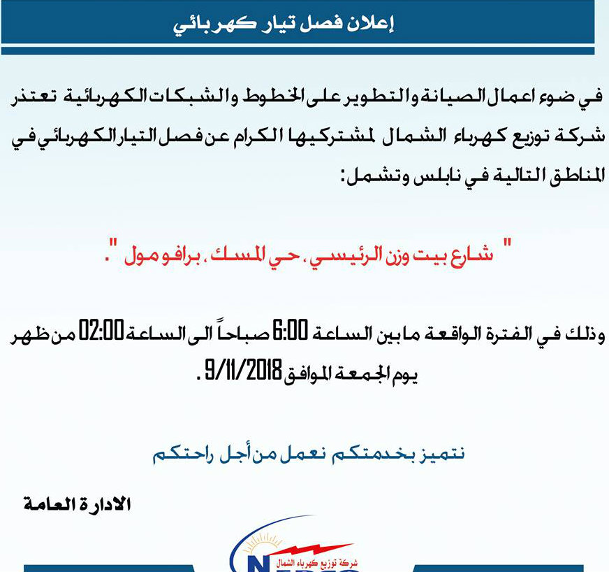 تعلن شركة توزيع كهرباء الشمال لمشتركيها في نابلس، عن اضطرارها فصل الكهرباء لثماني ساعات وذلك يوم الجمعة 08.11.2018.