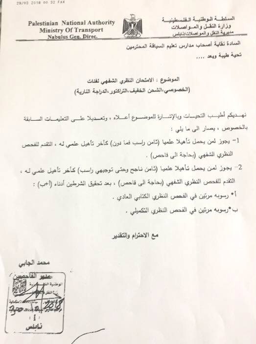 نشرت نقابة أصحاب مدارس تعليم السياقة في نابلس يوم الثلاثاء 06.11.2018، تعليمات بخصوص امتحان السياقة، وذلك تبعا للمرفق.