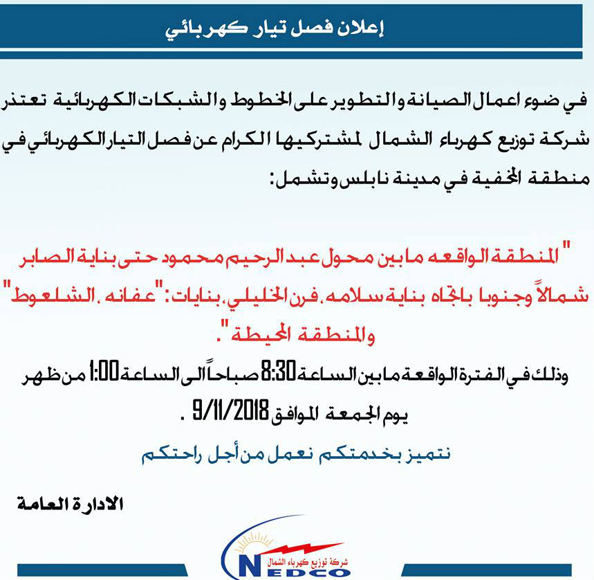 شركة توزيع كهرباء الشمال تعلن عن فصل التيار الكهربائي في نابلس.