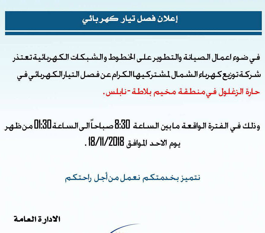 شركة توزيع كهرباء الشمال تعلن لمشتركيها عن اضطرارها فصل الكهرباء لخمس ساعات في نابلس.