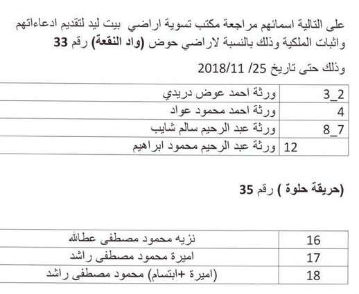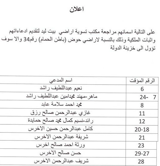 بلدية بيت ليد تنشر قائمة بأسماء من عليهم مراجعتها لتقديم ادعاءاتهم.