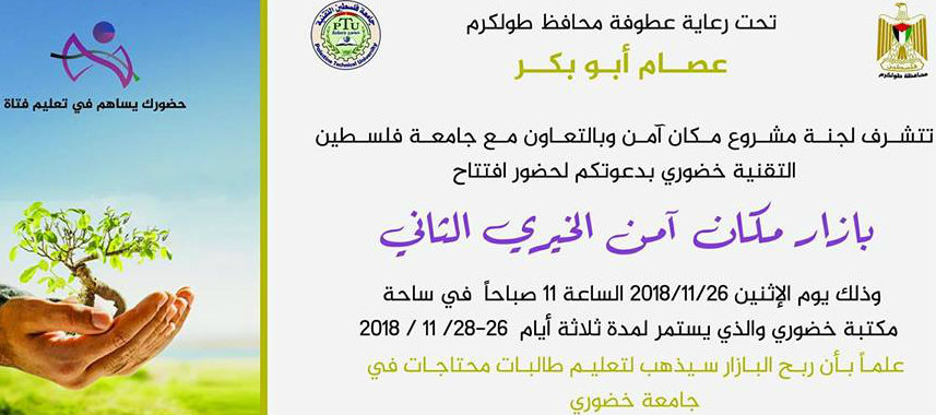 لأننا بنحبكم وبنحب تكونوا معنا بكل صغيرة وكبيرة، ولأنكم كنتو قريبين في بازارنا الأول في جامعة القدس -أبو ديس، قررنا نعمل بازار جديد بعنوان "بازار مكان آمن الخيري الثاني" اللي رح يكون في جامعة خضوري وتحت رعاية محافظ طولكرم عصام أبو بكر، واللي رح يستمر ل3 أيام، وببدأ يوم الاثنين 26-11-2018 وينتهي يوم الأربعاء 28/11/2018، في "ساحة المكتبة"