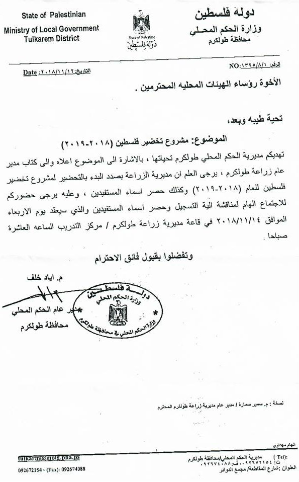 مديرية الحكم المحلي في طولكرم بصدد التحضير لمشروع تخضير فلسطين للعام 2018-2019.