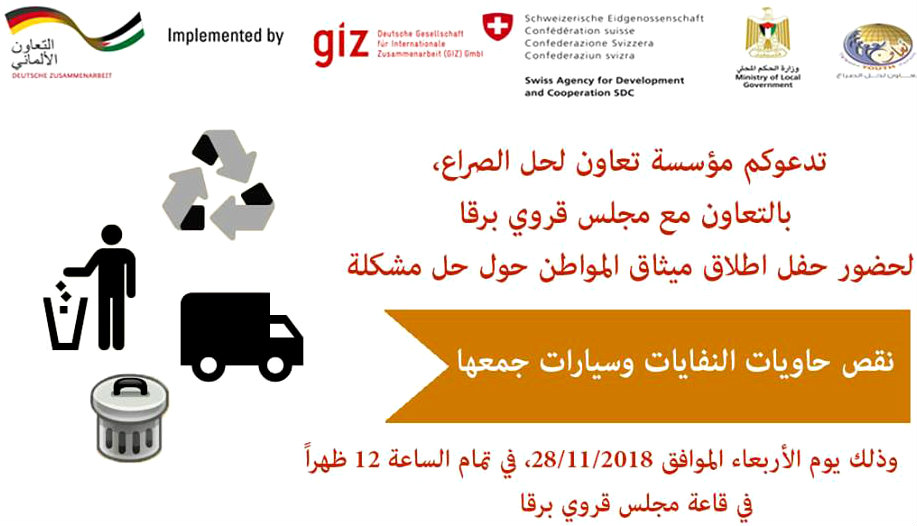 يدعوكم مجلس قروي برقة بالتعاون مع مؤسسة تعاون لحل الصراع، لحضور حفل إطلاق ميثاق المواطن حول حل مشكلة (نقص حاويات النفايات وسيارات جمعها) وذلك يوم الأربعاء الموافق 28/11/2018 في تمام الساعة 12 ظهراً في قاعة مجلس قروي برقة.