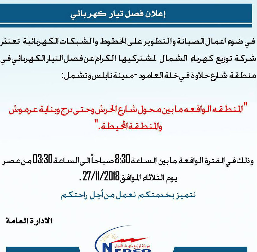 شركة توزيع كهرباء الشمال تعلن عن نيتها فصل الكهرباء في نابلس.