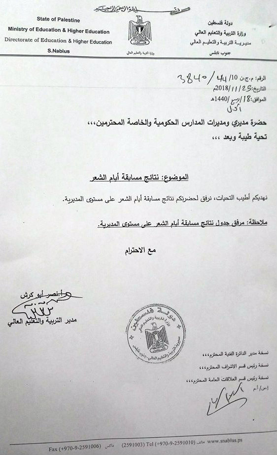 مديرية تربية جنوب نابلس تنشر نتائج مسابقة الشعر التي أقامتها وزارة التربية والتعليم للمدارس الحكومية والخاصة.