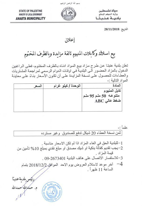 بلدية عنبتا تطرح أسلاك وكابلات ألمنيوم في مزاد علني.