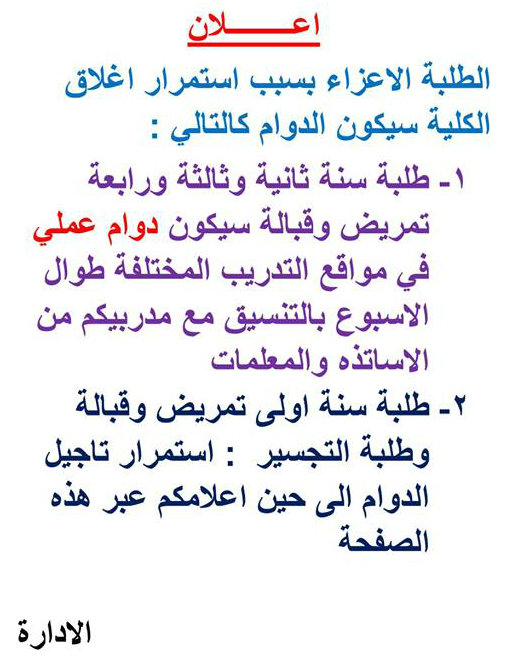 كلية ابن سينا للعلوم الصحية تنشر مواعيد الدوام العملي لطلابها، علماً أنها لا تزال مغلقة.
