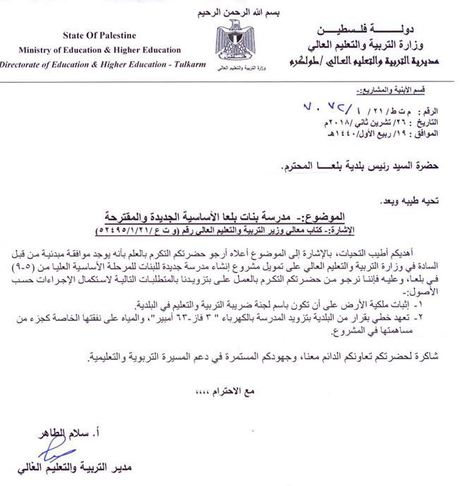 جاء ذلك بعد الانتهاء من إعداد التصاميم الهندسية لإضافة جناح من طابقين في مدرسة ذكور بلعا الأساسية بتمويل من وزارة التربية والتعليم، كما وعدت بمباشرة العمل بداية عام 2019.