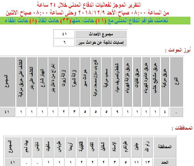 تعاملت طواقم الدفاع المدني خلال يوم الأحد 09.12.2018، حتى صباح الاثنين 10.12.2018، مع 41 حادثاً منها 8 حالات إطفاء وحوادث حرائق و33 حالة تقديم مساعدة وحوادث إنقاذ في محافظات الضفة.