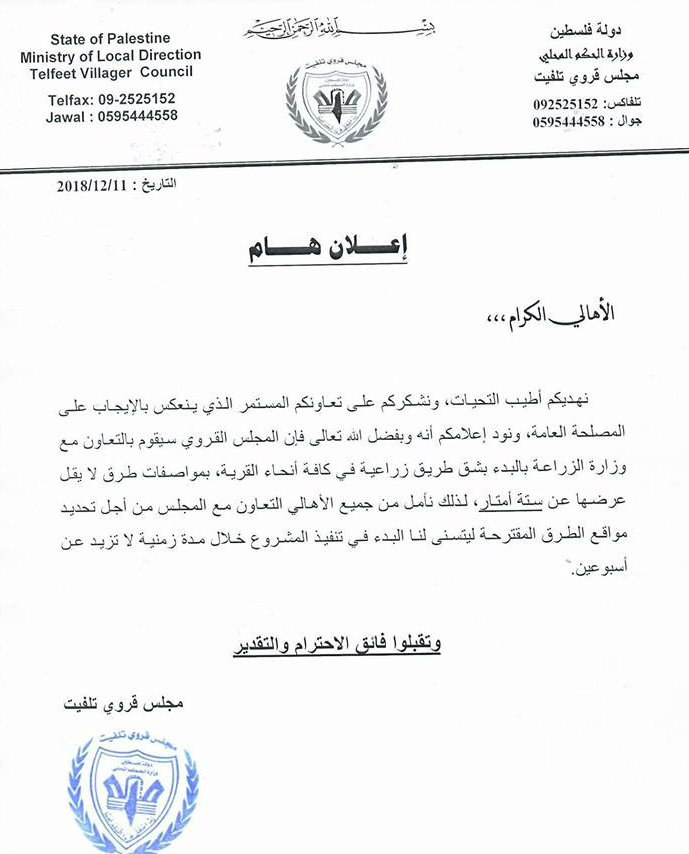 مجلس قروي تلفيت يدعو إلى اقتراح مواقع لشق طرق زراعية فيها.