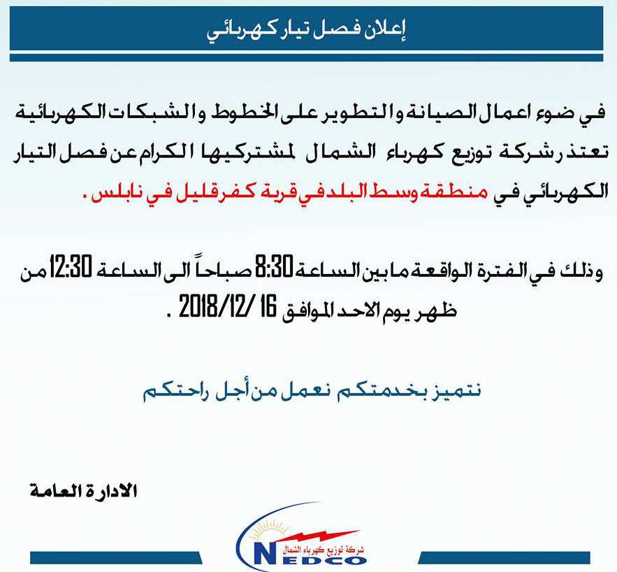 شركة توزيع كهرباء الشمال تعلن عن فصل الكهرباء في كفر قليل.