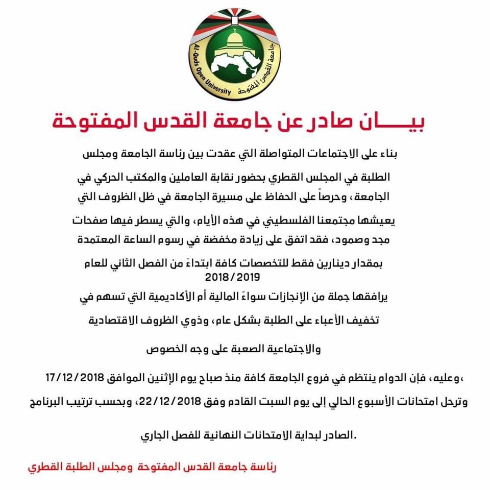أعلنت إدارة جامعة القدس المفتوحة، ومجلس الطلبة القطري، السبت 15.12.2018، عن التوصل إلى اتفاق بخصوص الرسوم الدراسية.