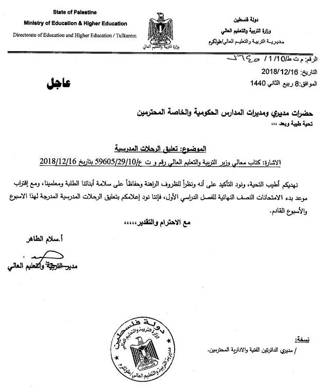 نظراً للظروف الراهنة، مديرية التربية والتعليم في طولكرم تعلق الرحلات المدرسية.