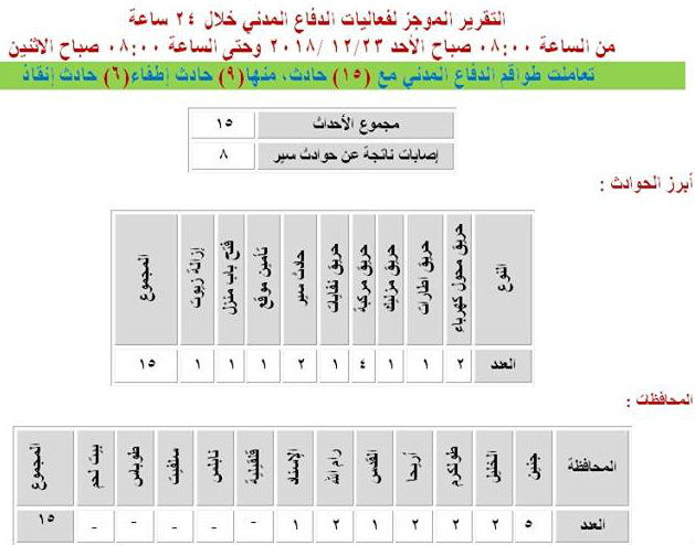 تعاملت طواقم الدفاع المدني خلال يوم الأحد 23.12.2018، حتى صباح الاثنين 24.12.2018، مع 15 حادثاً منها 9 حالات إطفاء وحوادث حرائق و6 حالات تقديم مساعدة وحوادث إنقاذ في محافظات الضفة.