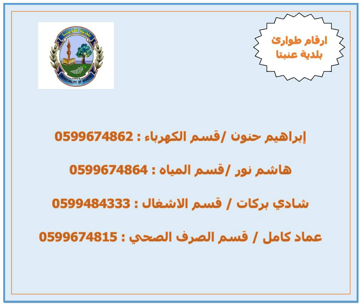 بلدية عنبتا تنشر أرقام تواصل في حالات الطوارئ.