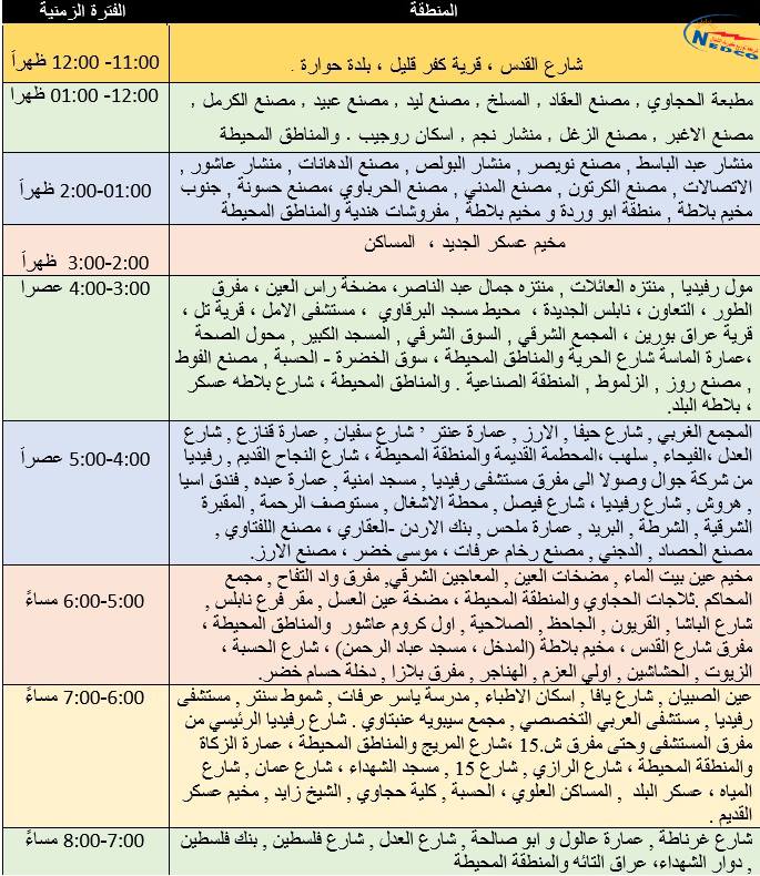 جدول فصل الكهرباء في نابلس