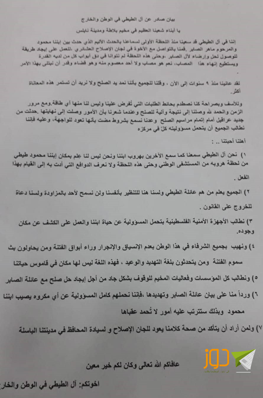 نابلس.. عائلة الطيطي ترد على بيان آل الصابر