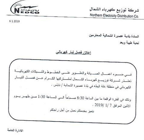 بلدية عصيرة الشمالية تعلن عن فصل الكهرباء خمس ساعات في البلدة.