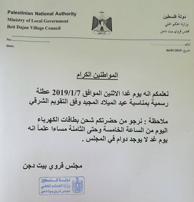 مجلس قروي بيت دجن يعلن عن موعد مركز شحن الكهرباء.
