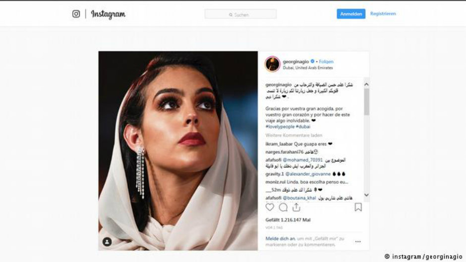 وحققت الصورة أكثر من مليون إعجاب ومئات التعليقات من معجبين معظمهم من العرب. ويبلغ عدد متابعي جورجينا رودريغز على موقع إنستغرام فقط أكثر من ثمانية ملايين شخص. وظهرت رودريغز البالغة من العمر أربعة وعشرين عاماً وهي ترتدي غطاء رأس وقفطاناً مغربياً. صورة لجورجينا رودريغز، صديقة النجم البرتغالي كريستيانو رونالدو، من حسابها في موقع انستغرام وارتبطت عارضة الأزياء الإسبانية بنجم يوفنتوس الإيطالي في نهاية 2016 وأنجبت منه في نوفمبر 2017 مولودها الأول والرابع لرونالدو، إذ أن النجم البرتغالي أب لثلاثة أطفال آخرين من علاقات سابقة.