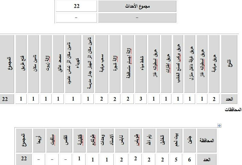 بالإضافة إلى العديد من تعاملات الدفاع المدني في مختلف المحافظات من سحب مركبات عالقة وتصريف لمياه الأمطار من داخل المنازل.