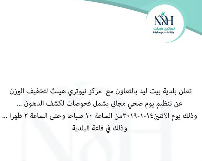 بلدية بيت ليد تعلن عن تنظيم يوم طبي مجاني لكشف نسبة الدهون في الجسم.