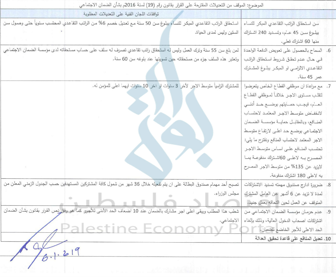 "كشفت بوابة اقتصاد فلسطين، الثلاثاء 15.01.2019، عن تفاصيل التعديلات على قانون الضمان الاجتماعي التي اعتمدها مجلس الوزراء الفلسطيني في جلسته الأسبوعية، والتي توافقت عليها اللجان الفنية مع النقابات المهنية والاتحادات القطاعية.