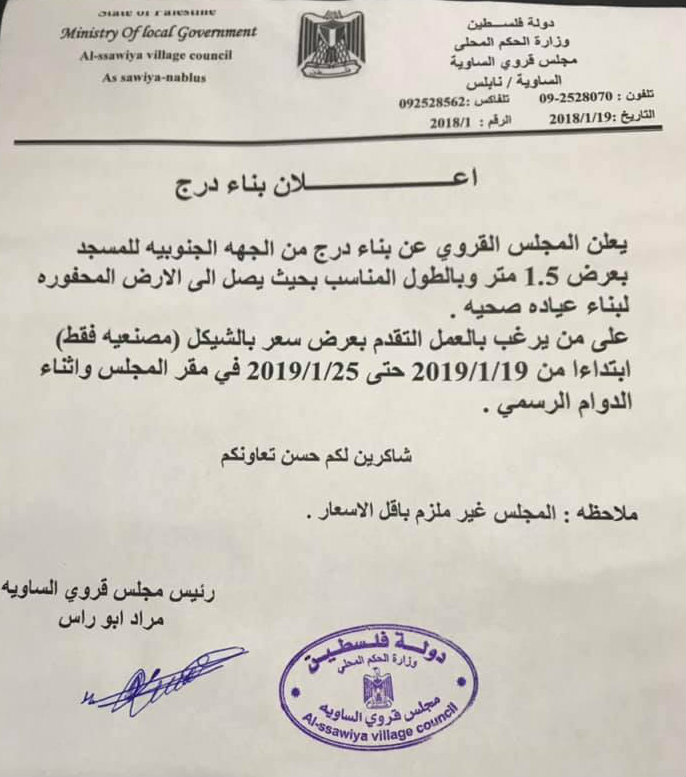 مجلس الساوية يعلن المشاركة في عطاء بناء درج خاص بمسجد جنوب القرية.