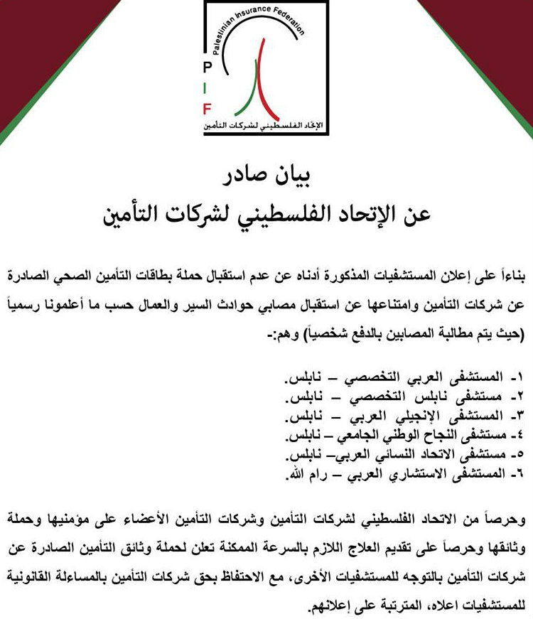 الاتحاد الفلسطيني لشركات التأمين ينشر بياناً رداً على قيام بعض المستشفيات بعدم استقبال حملة بطاقات التأمين الصحي وإجباره المرضى على الدفع المسبق قبل تلقي العلاج.