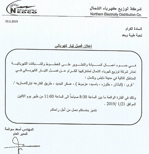شركة توزيع كهرباء الشمال تعلن عن نيتها فصل الكهرباء للصيانة.