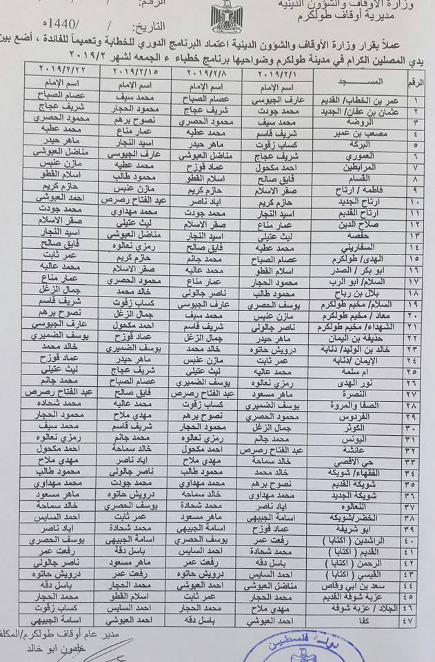 خطباء صلاة الجمعة في مساجد مدينة طولكرم وضواحيها ليوم الجمعة 01.02.2019.