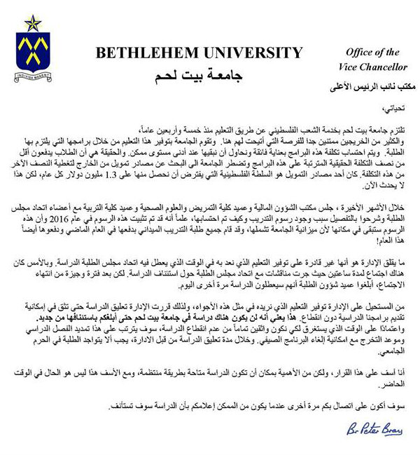 أعلنت جامعة بيت لحم، يوم الخميس 07.02.2019، عن تعليق الدراسة في الجامعة وذلك بسبب الأزمة المالية التي تواجهها الجامعة، دوز ينشر البيان: