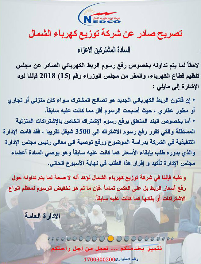 شركة توزيع كهرباء الشمال تنشر تصريحاً ترد به على ما تم نشره من إشاعات حول رفع رسوم الربط.