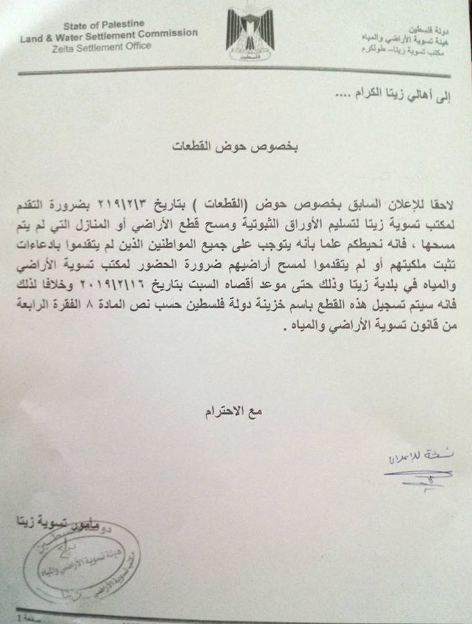 بلدية زيتا تعلن بدء أعمال التسوية في حوض قطعات، وتدعو لتسليم الأوراق الثبوتية بشأنه.