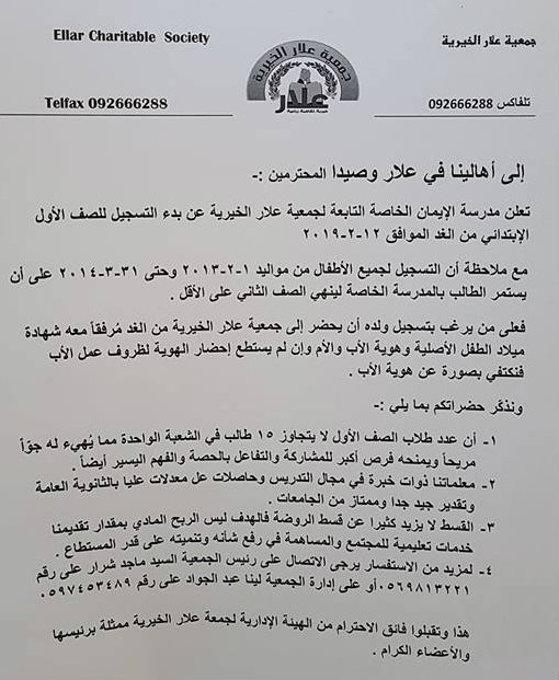 مدرسة الإسيمان الخاصة والتابعة لجمعية علار الخيرية، تعلن عن بدء استقبال الطلبة المسجلين للصف الأول الابتدائي ضمن شروط محددة.