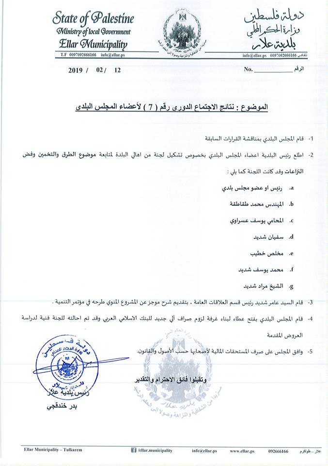 نشرت بلدية علار، يوم الثلاثاء 12.02.2019، محضر اجتماع المجلس البلدي رقم 7/2019، تحقيقا لمبدأ الشفافية والنزاهة.
