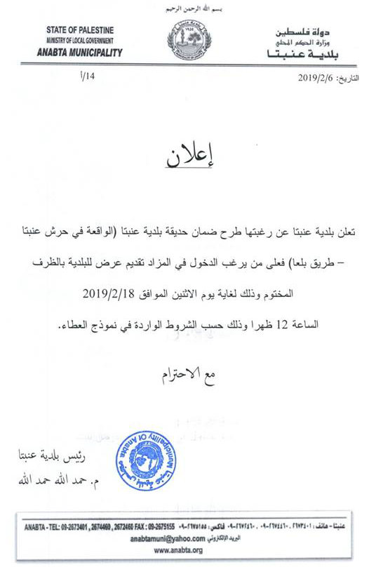 بلدية عنبتا تعلن عن طرح عطاء تضمين حديقة البلدية.